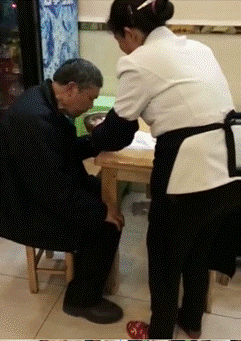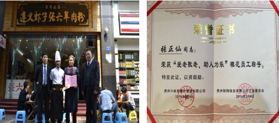 2016年3月6日晚,遵義蝦子張六羊肉粉普陀路店出現(xiàn)了溫馨的一幕:粉店員工張正仙與一位吃粉的老人并不認識,當(dāng)時老人與一名老阿姨一起來到粉店,進來時張大姐就注意到老人走路不太方便。粉端上桌后,與老人一起來的老阿姨就離開了,老人用右手顫顫巍巍地夾起粉朝嘴里送,很是費勁,張大姐看著有點不忍,就走上前去問老人是否需要幫忙。在征得老人同意后,她像照顧自家的老人一樣,站在老人面前,左手端著羊肉粉,耐心地喂老人,擔(dān)心熱湯熱粉燙到老人,張大姐一邊吹冷一邊喂,慢慢的將粉喂完后,才繼續(xù)忙自己的工作。