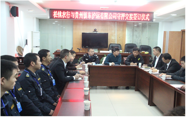 經(jīng)過半年的業(yè)務(wù)對接和洽談,銅仁本部于11月16日至20日正式接手德江、石阡、印江、江口、松桃五縣農(nóng)業(yè)銀行守押業(yè)務(wù)。銅仁市公安局保安大隊大隊長王世軍、銅仁市農(nóng)行副行長任達輝、銅仁市農(nóng)行保衛(wèi)部經(jīng)理楊猛、銅仁本部總經(jīng)理陳葉、副總經(jīng)理劉興華、劉樹等出席了五縣守押業(yè)務(wù)交接儀式。