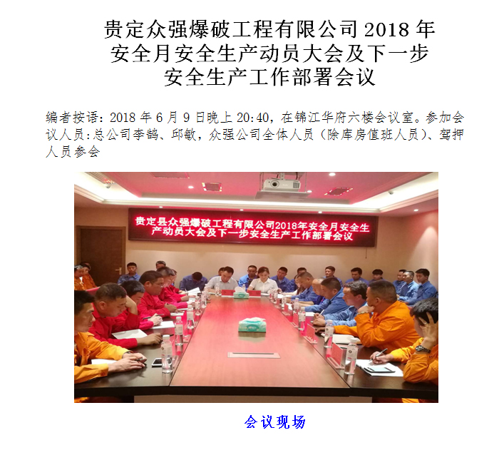 > 貴定眾強(qiáng)爆破工程有限公司2018年 安全月安全生產(chǎn)動(dòng)員大會(huì)及下一步 安全生產(chǎn)工作部署會(huì)議